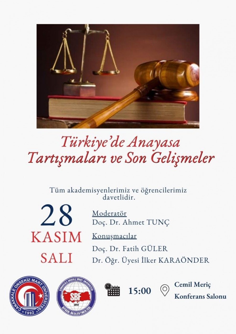 Fakültemiz SBKY Öğretim Üyesi Doç. Dr. Ahmet Tunç'un moderatörlüğünde, Doç. Dr. Fatih Güler'in ve Dr. Öğr. Üyesi İlker Karaönder'in konnuşmacı olarak katılacağı "Türkiye'de Anayasa Tartışmaları ve Son Gelişmeler" başlıklı panel 28 Kasım 2023 Salı günü saat 15.00'te SBF Cemil Meriç Konferans Salonunda gerçekleştirilecektir.