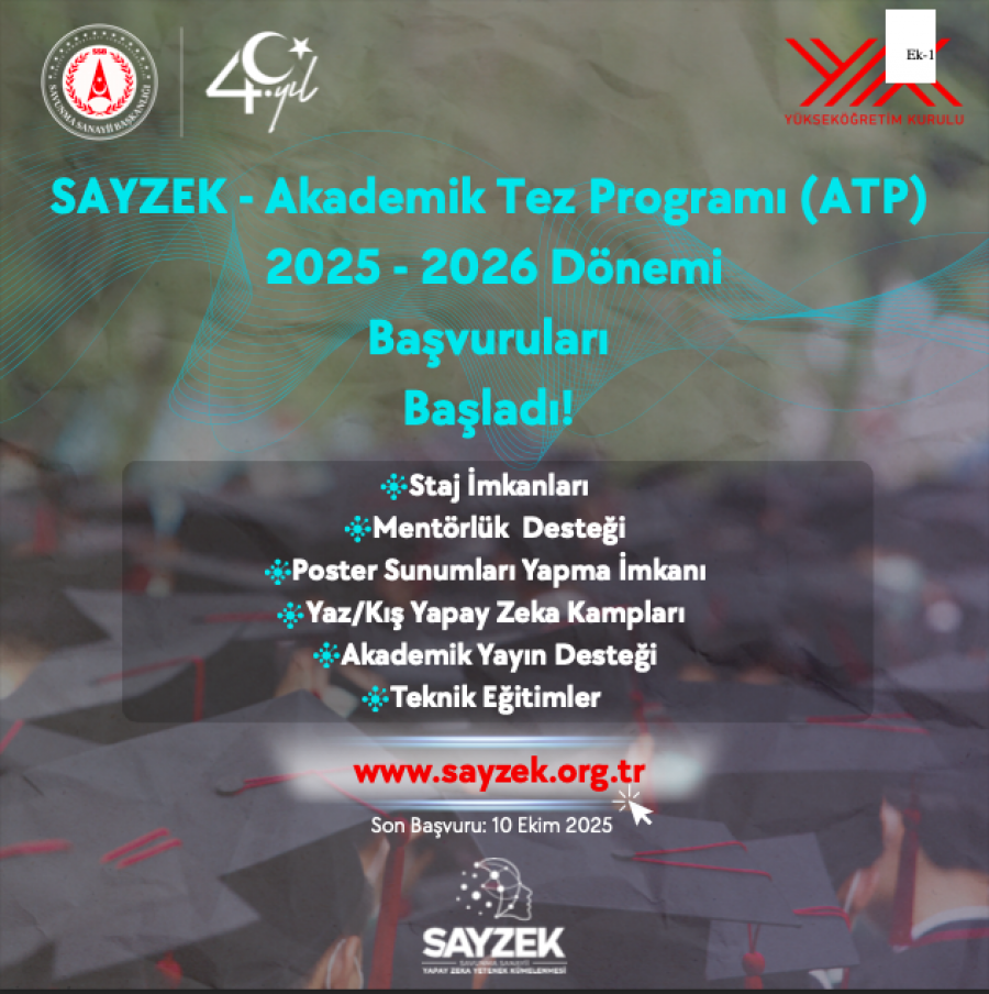 Yükseköğretim Kurulu ve Savunma Sanayii Başkanlığı iş birliğiyle yürütülen Yapay Zekâ Akademik Tez Programı (SAYZEK-ATP) kapsamında 2025–2026 dönemi başvuruları alınmaya başlamıştır.