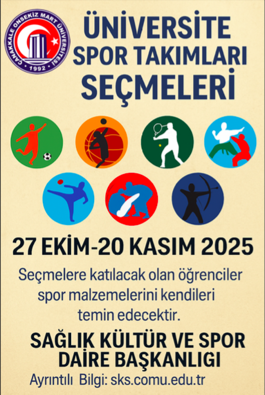 Türkiye Üniversite Sporları Federasyonu tarafından 2025-2026 eğitim-öğretim yılında düzenlenecek ulusal ve uluslararası organizasyonlarda Üniversitemizi temsil edecek spor takımlarının oluşturulması amacıyla sporcu seçmeleri yapılacaktır.